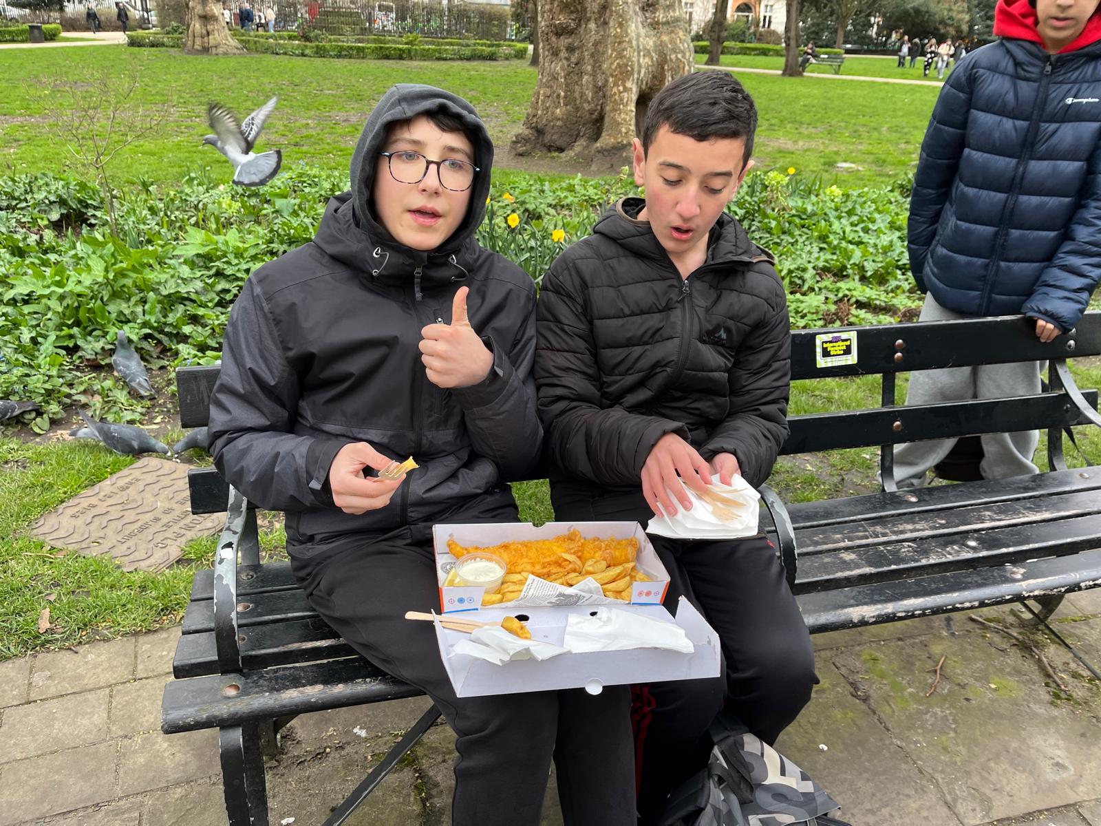 Pause déjeuner façon britannique : installés sur les bancs d’un parc londonien, on savoure un fish and chips tout chauds. Entre les frites qui s’envolent, les doigts pleins de graisse on peut dire qu’on a enfin goûté à la vraie vie londonienne — celle où même le pique‑nique devient un sport extrême.